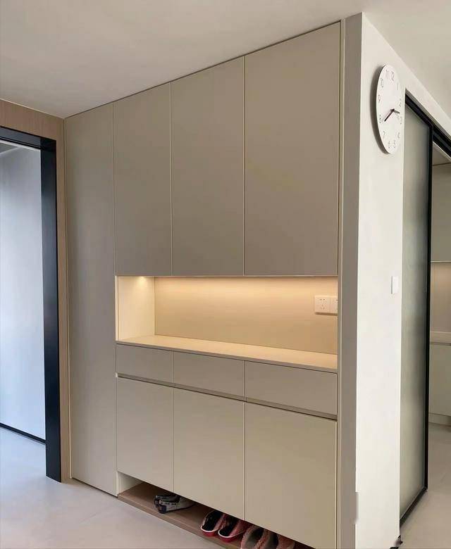 别只给智能鞋柜留电!在玄关柜的中间开放格背后预留一个插座,回家就能给手机、智能门锁充电。出门前用烘鞋器也方便,再不用弯腰找地插。