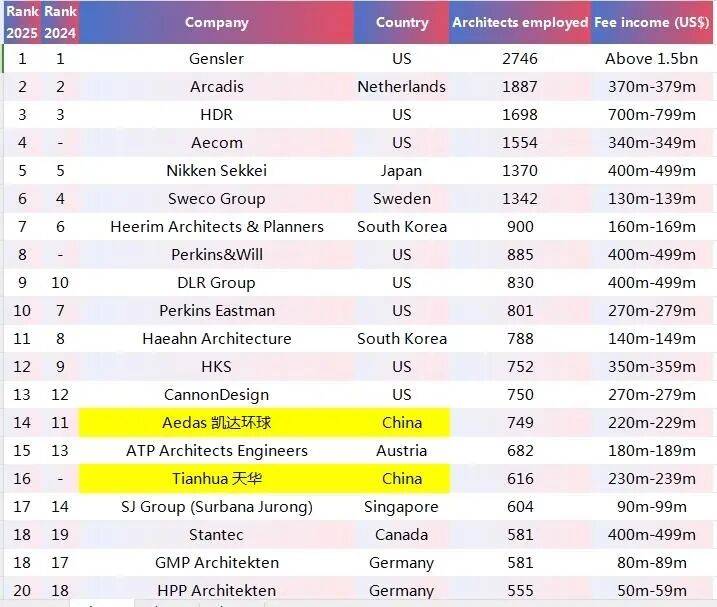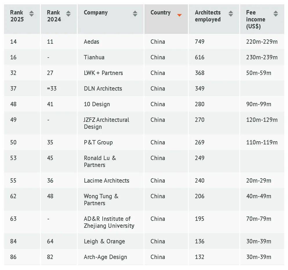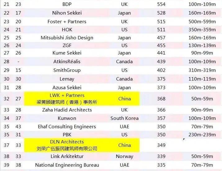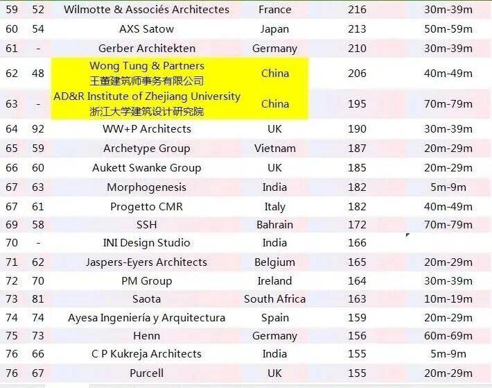 在WA100的榜单上有13家企业,分别为凯达环球、天华建筑设计、梁黄顾建筑师事务所、刘荣广伍振民建筑师事务所、拾稼设计、基准方中、巴马丹拿集团、吕元祥建筑师事务所、日清设计、王董集团、浙江大学建筑设计研究院、利安顾问、长厦安基。