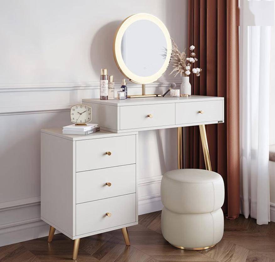 多抽屉设计提供了丰富的收纳空间,可以分类存放各种化妆品和护肤品。静音滑轨确保了抽屉推拉时的顺滑体验,不会产生噪音干扰。金色妆镜增添了轻奢的质感,提升了整体的时尚度。