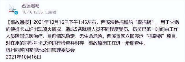 比如 2021 年,杭州西溪湿地就推出了摇摇锅项目(让游客在湿地的摇橹船上用卡式炉煮火锅),结果“摇摇锅”突然发生了喷火事件,导致周围 5 人被不同程度烫伤。事件发生之后,景区也立即下架了“摇摇锅”项目。