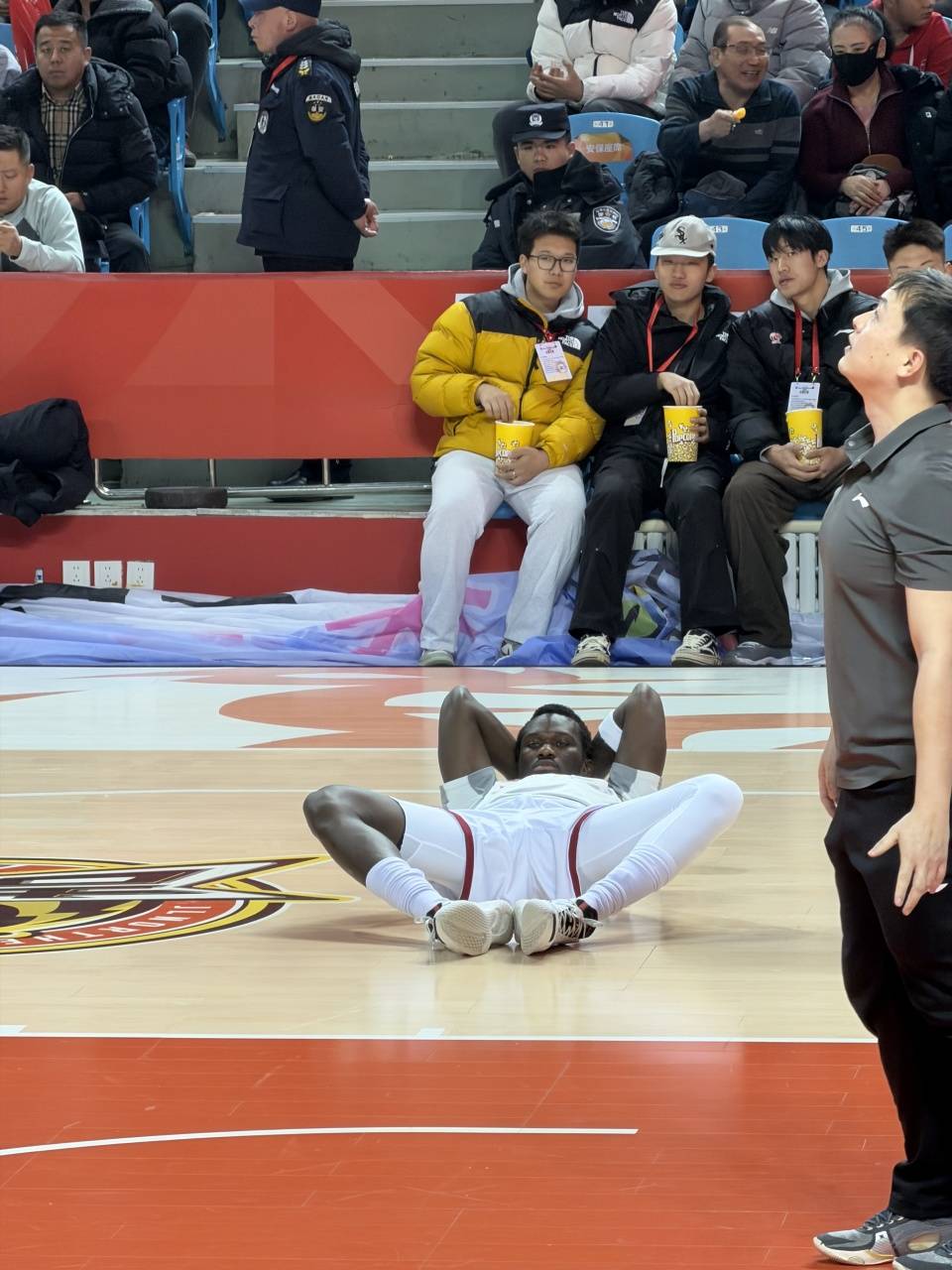 球员一味的赛场热身,对于球员来说也是等待的略微枯燥,包括法耶已经躺在了地板之上,一直等待着比赛开场,可谓十分悠闲,赛场观众也是等待的喊起了退票。