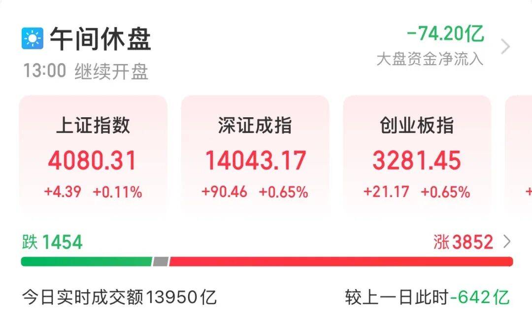 2月6日早盘,A股市场低开高走,主要指数集体翻红。截至午间收盘,上证指数报4080.31点,涨0.11%;深证成指涨0.65%,创业板指涨0.65%,科创综指涨0.51%。沪深北三市半日成交13950亿元,中际旭创成交额115.32亿元,再度位居A股第一。