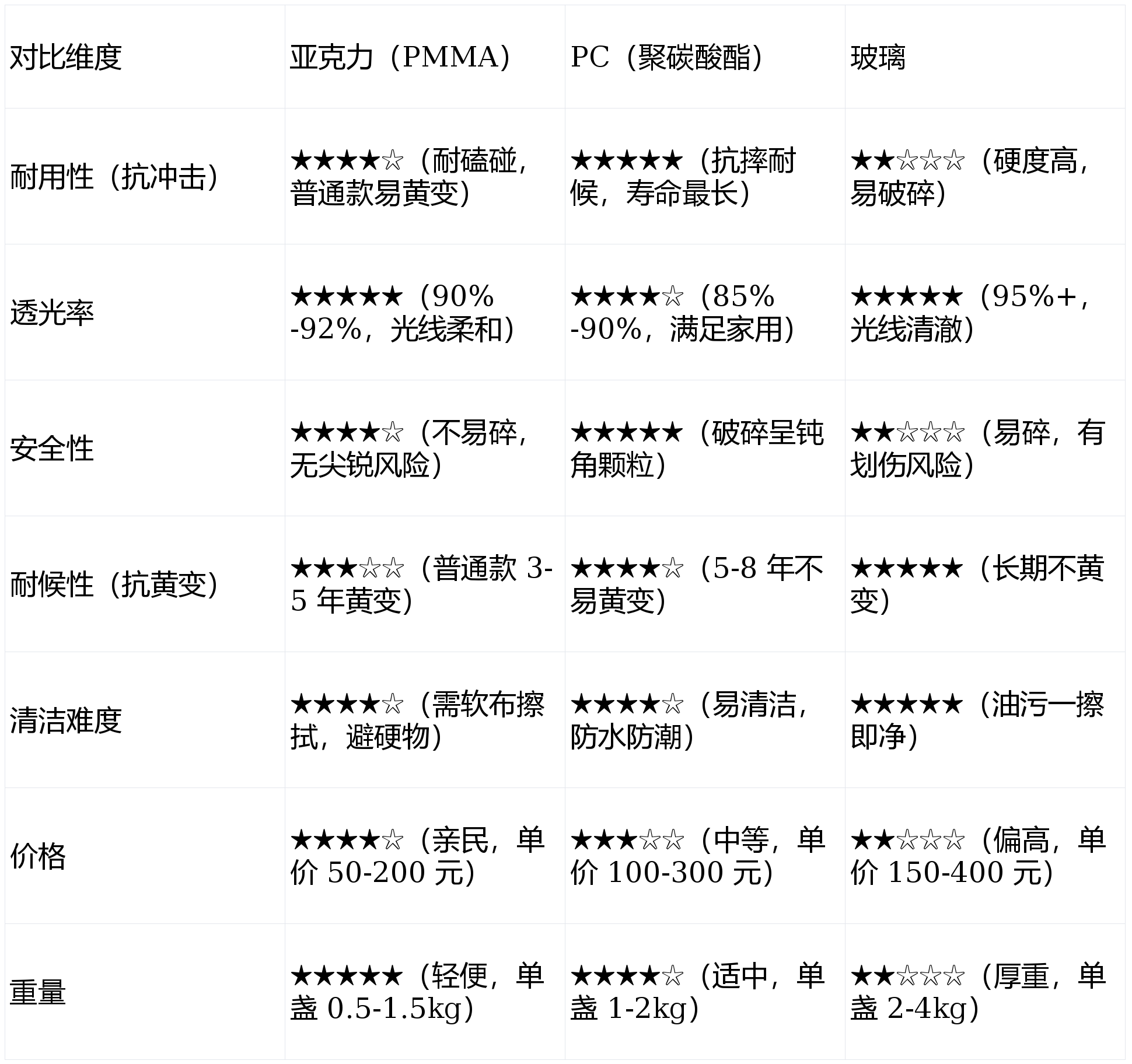 1. 亚克力(PMMA):性价比之选,家用主流