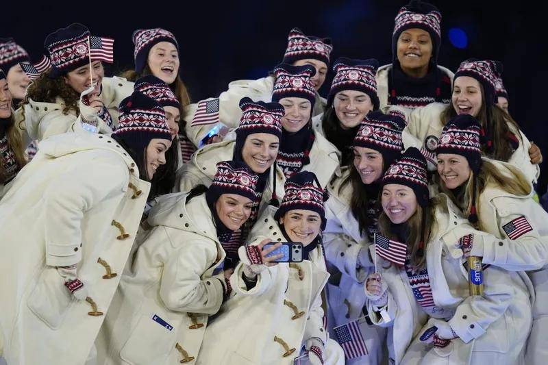 美国代表队的服装第十次由Ralph Lauren合作,白色羊毛大衣,特意配上了经典的木质扣子,内搭毛衣也加入了美国国旗的元素。看上去很有学院风了。