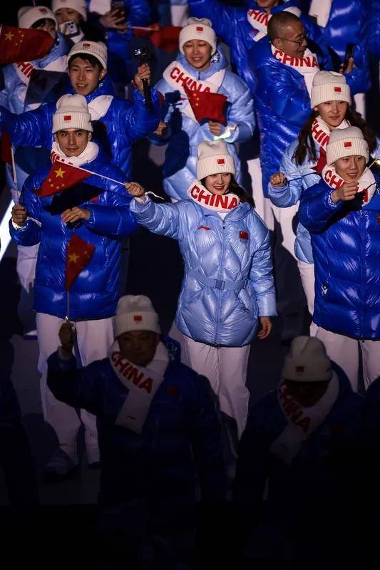 而在运动员们的冬装走秀环节,我们最关注的那肯定是中国代表队的入场拉,这次中国代表队告别了传统的红黄配色,而是以一抹让人惊喜的蓝色亮相。出场服由李宁专为开幕式设计,以“冰穹蓝”、“雪山白”为主色调,代表“破冰前行”,采用科技感光泽轻薄面料+符合人体工学的绗缝工艺,女款还加了收腰设计,不少网友在线求同款。