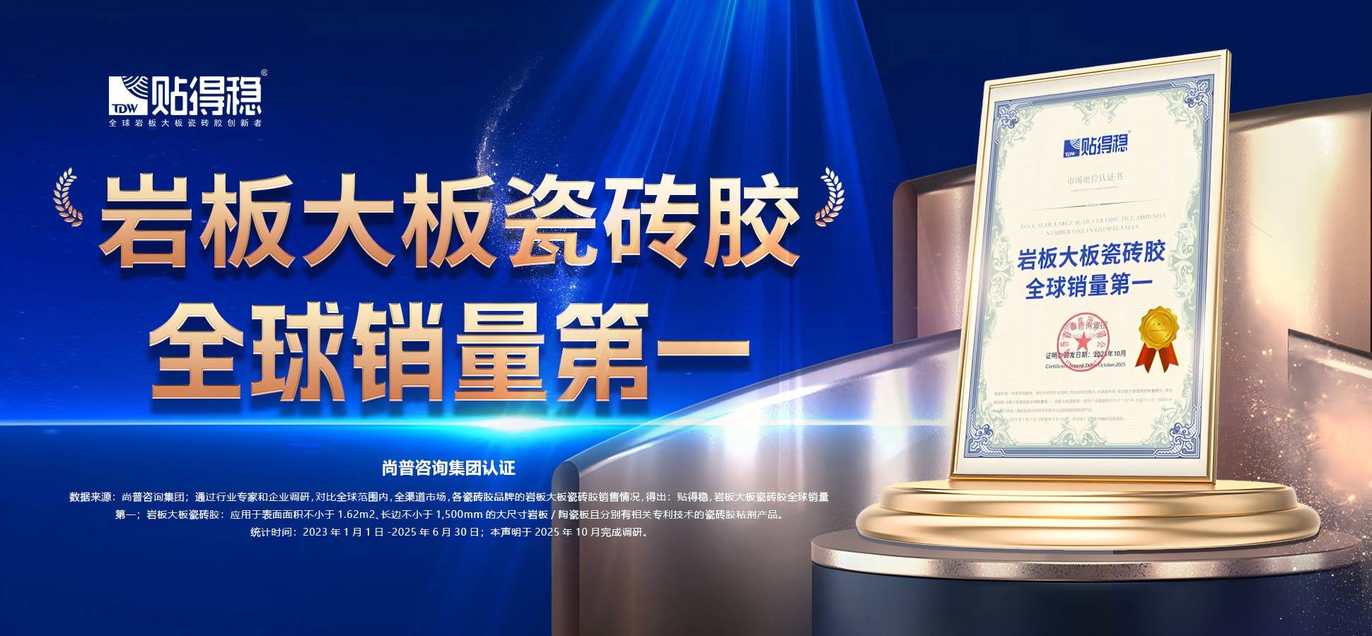 (2026年2月13日 佛山讯) 全球岩板大板瓷砖胶赛道迎来历史性时刻——经国际权威市场研究机构尚普咨询集团严格审计认证,贴得稳正式摘得“岩板大板瓷砖胶全球销量第一”“全球开创者”“全球领导者”三项重量级桂冠,成为该细分领域首个斩获全球销量冠军的中国品牌。这一认证不仅刷新了中国建材辅材品牌在国际市场的竞争位次,更标志着以贴得稳为代表的本土瓷砖胶企业已从技术追随者蜕变为全球规则制定者。
