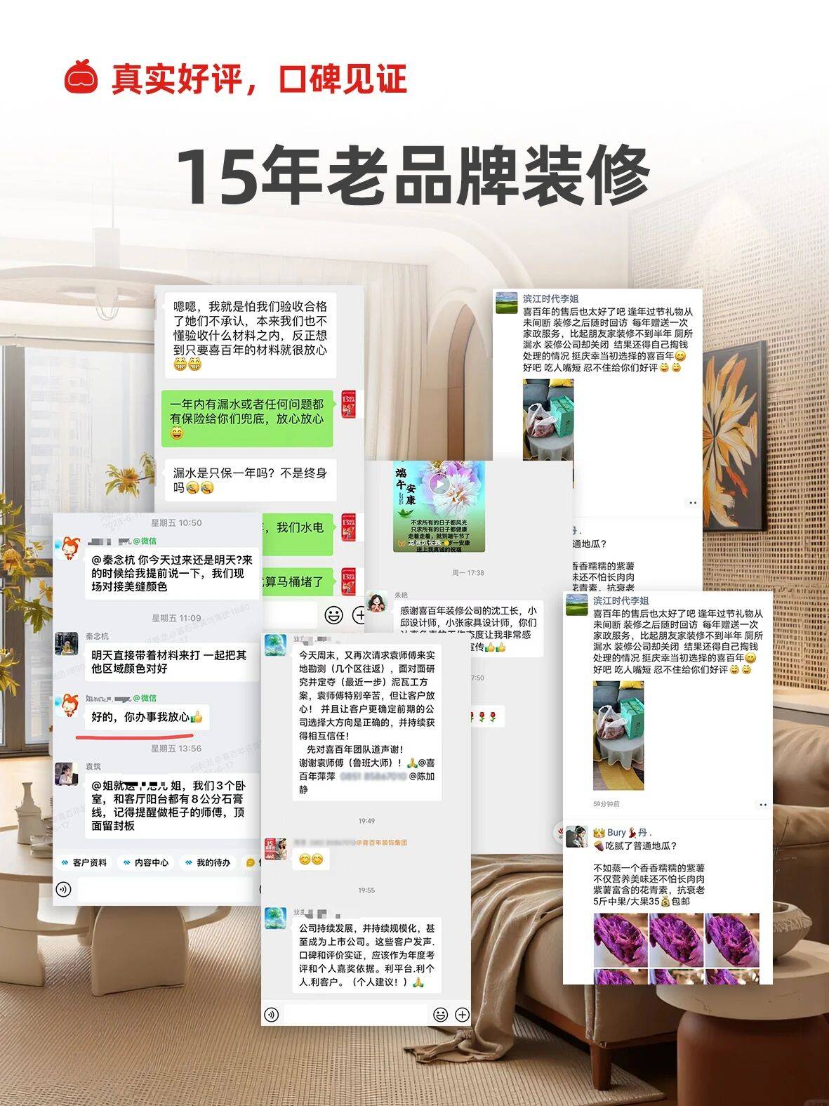 不同装修场景的业主对喜百年都给出了真实且积极的评价。刚需上班族祁女士表示:很满意喜百年的省心和透明,我平时工作忙,工程管家每天在群里发施工进度和细节照片,疑问回复及时。签合同时所有项目和报价都清晰明了,全程无隐形增项,和约定预算基本一致。选用的材料也符合合同标注品牌,性价比不错,装完通风后入住无明显异味,已推荐给准备装修的朋友。新婚业主邹先生称:我们装修婚房偏爱美式风格,设计师很有耐心,设计图反复修改三次直至我们满意。施工工人干活细致,水电走线、墙面涂刷的细节把控到位,与效果图还原度很高。阳台改书房、次卧做榻榻米的改造合理,充分利用空间。装修完赠送保洁服务,省去不少麻烦,整体体验顺畅。老房改造施先生说:我家十年老房存在墙面开裂、收纳不足的问题,喜百年设计师结合老房结构,给出的方案既保留原有户型优势,又解决了痛点。施工时优化冬季施工工艺,避免墙面再次开裂,工人是自有团队,施工规范、现场整洁。装完后收纳空间大幅增加,墙面平整,家人都很满意,能感受到品牌的用心。