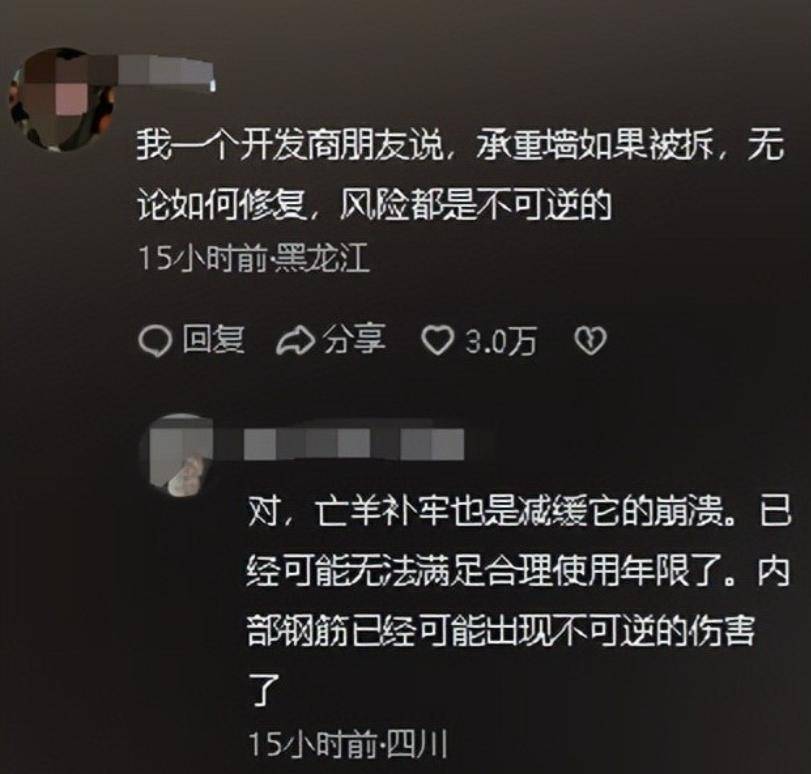 事件曝光后,业主们的愤怒情绪无法掩盖。除了追查肇事者,物业的责任也被推到风口浪尖。物业承认存在管理疏忽,尤其是对承重墙的监管不力。虽然承重墙应该有明确标识并进行备案,但在实际操作中,这一监管制度并没有发挥作用,致使楼体遭到破坏而无人察觉。