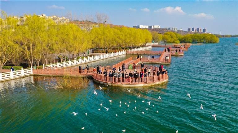 平顶山市白龟湖国家湿地公园内,成群的红嘴鸥在碧绿的湖面上嬉戏。河南日报全媒体记者 聂冬晗 摄