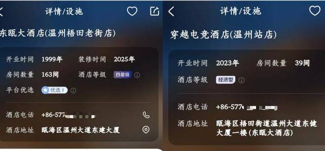 对此,上游新闻记者以顾客身份联系到东瓯大酒店,其工作人员表示,酒店为四星级酒店,2025年进行了重新装修。当记者问及穿越电竞酒店是否也在同一幢楼里时,工作人员称,两家酒店实际为同一家酒店,2025年新装修的房间是东瓯大酒店的,价格高。价格低的房间就是穿越电竞酒店的,就是没有装修的房间。“但是也要看房型,(两家酒店)有的房间就是在同一层。东瓯大酒店房型紧张时,有可能会安排入住穿越电竞酒店的房间。如果不放心可以现场看完后再预定。”