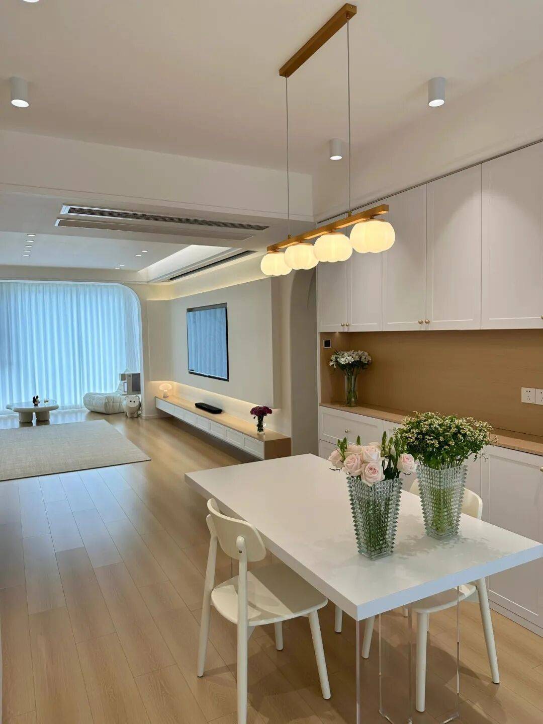 客餐厅一体化设计,动线通透流畅。客厅以奶白墙面搭配浅橡木地板,悬浮式原木电视柜简洁利落,无主灯暖光与柔纱帘引入的自然光,勾勒出慵懒质感。餐厅纯白岩板餐桌搭配简约餐椅,木质长条吊灯点亮空间,餐边柜兼顾收纳与颜值,每一处都透着清爽与温馨。