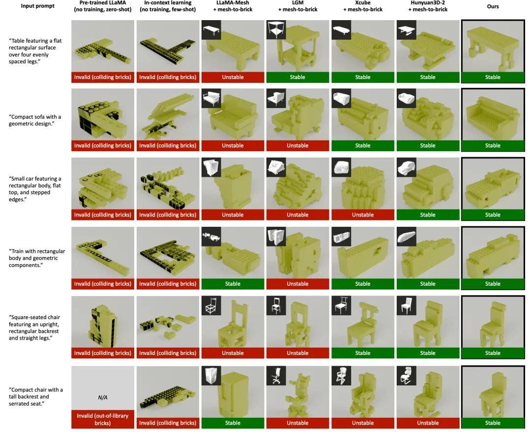 将该论文方法与多种基线模型进行对比评估,评价指标包括:有效性(validity):是否存在超出积木库、越界或相互碰撞的积木;稳定性(stability);基于 CLIP 的文本相似度以及基于 DINOv2 的图像相似度。其中,稳定性、CLIP 相似度和 DINO 相似度的计算仅针对有效结构进行。对于 LLaMA-Mesh ,有效性要求其生成的 OBJ 文件格式正确。