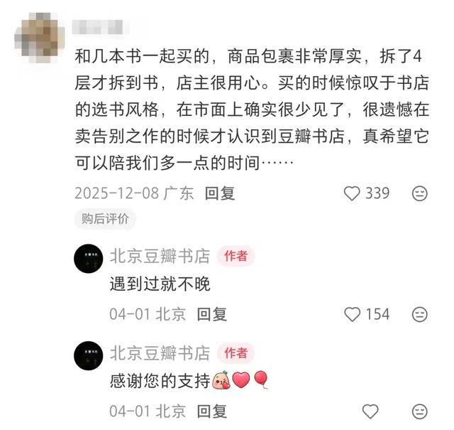 评论区里,不少网友表达不舍。有网友评论称:“第一次去豆瓣书店还是上学的时候,转瞬十多年过去,怀念!也祝老板越来越好”“真希望它可以陪我们多一点的时间”“能不能不分开”。