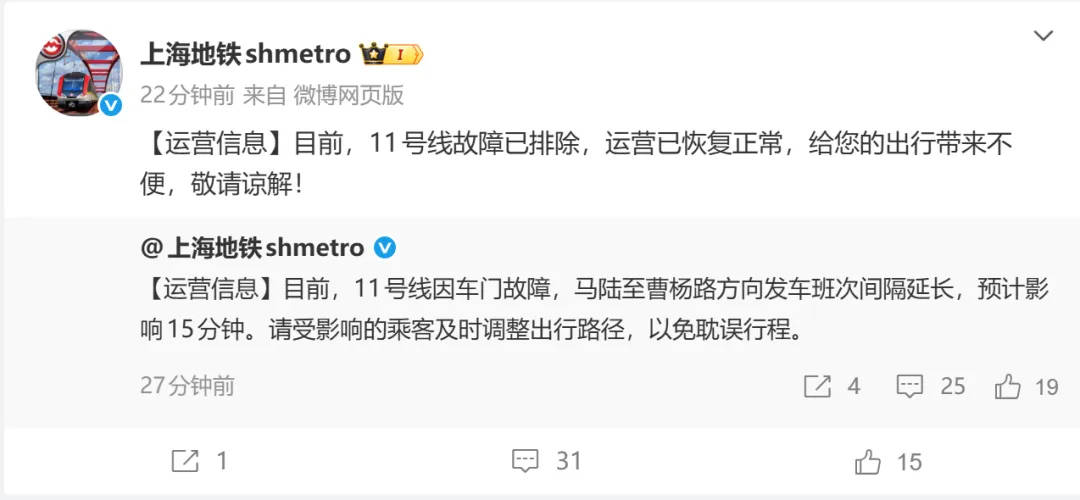 目前,11号线因车门故障,马陆至曹杨路方向发车班次间隔延长,预计影响15分钟。请受影响的乘客及时调整出行路径,以免耽误行程。