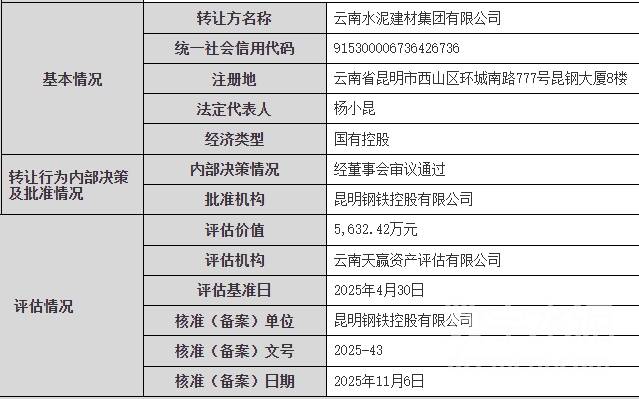 日前,根据相关平台显示,云南水泥建材集团有限公司楚雄基地资产转让(国资监测编号GR2025YN1001424),转让底价为5636万元。