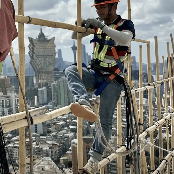 施工效率与人力结构固化,让竹脚手架难以替代。香港建筑业长期面临用工荒,而搭建竹脚手架的主力是掌握传统技艺的老工人,他们凭借多年经验,半天就能搭建出大面积架子,且能根据弧形、尖角等复杂建筑轮廓灵活切割、绑扎。