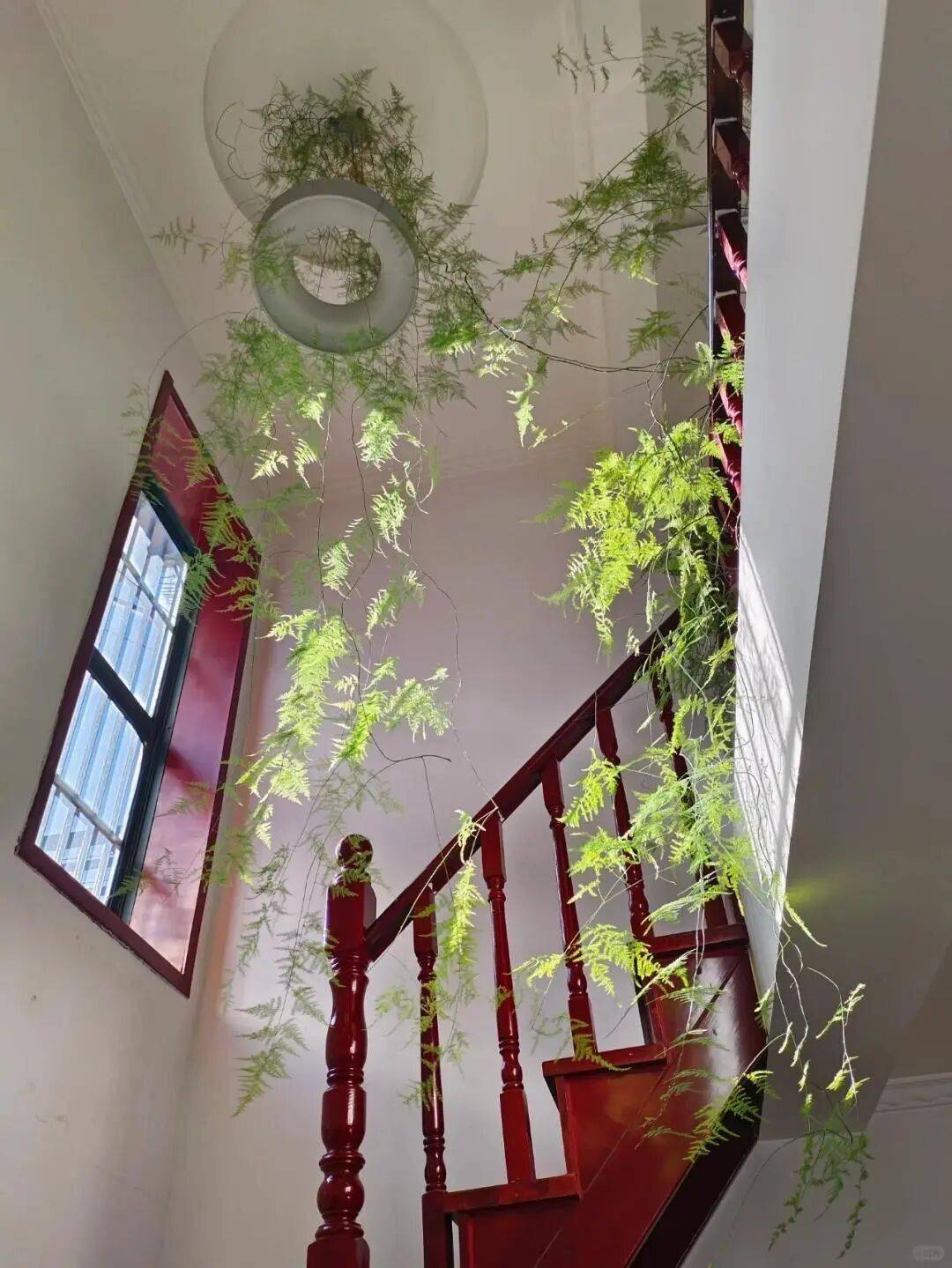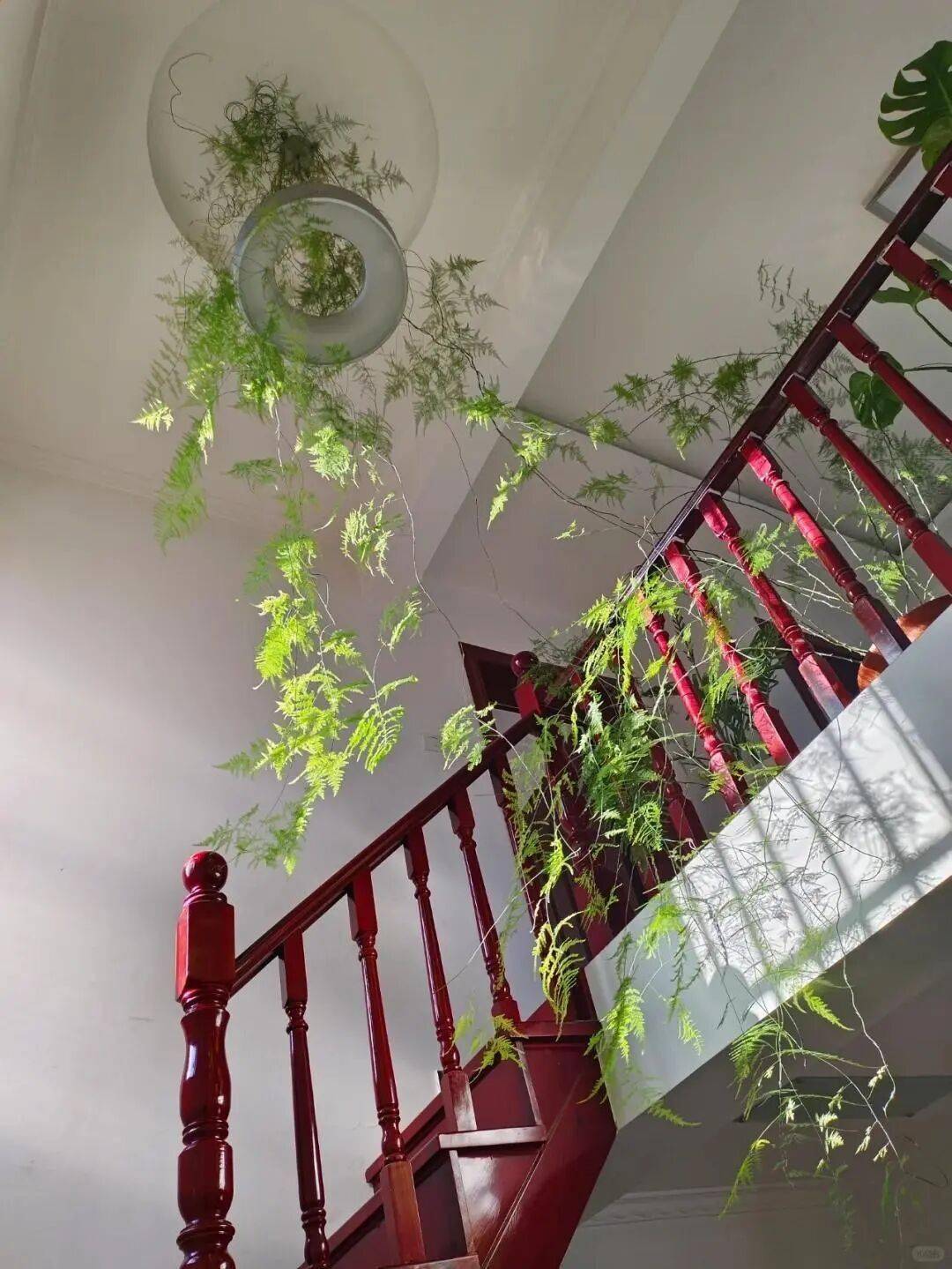 小姐姐说,这棵文竹刚入手时就是株小苗,没想到越养越疯长。她舍不得修剪,就做了简单牵引,让它顺着楼梯扶手往上爬,慢慢引到吊灯周围。