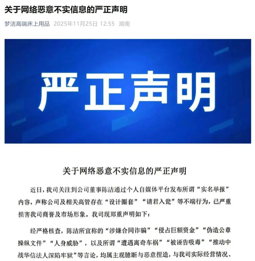 面对指控,梦洁股份迅速发布严正声明予以否认,并宣布已启动司法程序维权。这场涉及上市公司控制权争夺、财务合规争议的风波,让成立 44 年的老牌企业陷入舆论焦点。