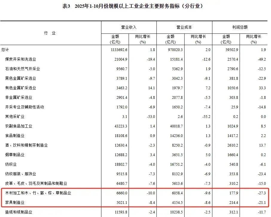 国家统计局11月27日发布数据显示,2025年1-10月,我国家具制造业利润总额为214.4亿元,同比下降21.1%,营业收入5021.1亿元,同比下降8.4%,行业整体仍处于调整周期。