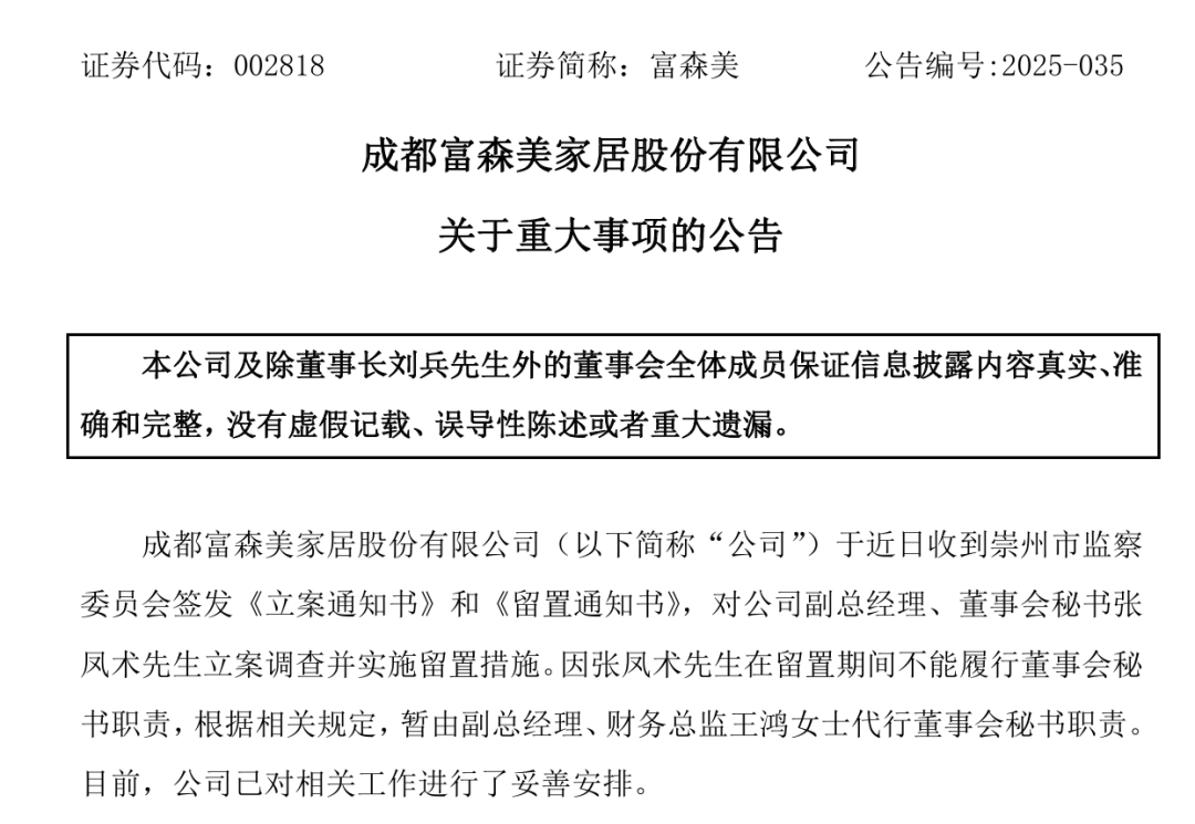 11月26日,富森美发布关于重大事项的公告,公司于近日收到崇州市监察 委员会签发《立案通知书》和《留置通知书》,对公司副总经理、董事会秘书张 凤术先生立案调查并实施留置措施。因张凤术先生在留置期间不能履行董事会秘书职责,根据相关规定,暂由副总经理、财务总监王鸿女士代行董事会秘书职责。