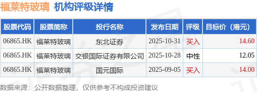 截至2025年12月1日收盘,福莱特玻璃(06865.HK)报收于10.45港元,与上一交易日持平,成交量211.53万股,成交额2214.57万港元。投行对该股的评级以买入为主,近90天内共有2家投行给出买入评级,近90天的目标均价为13.55港元。东北证券最新一份研报给予福莱特玻璃买入评级,目标价14.6港元。