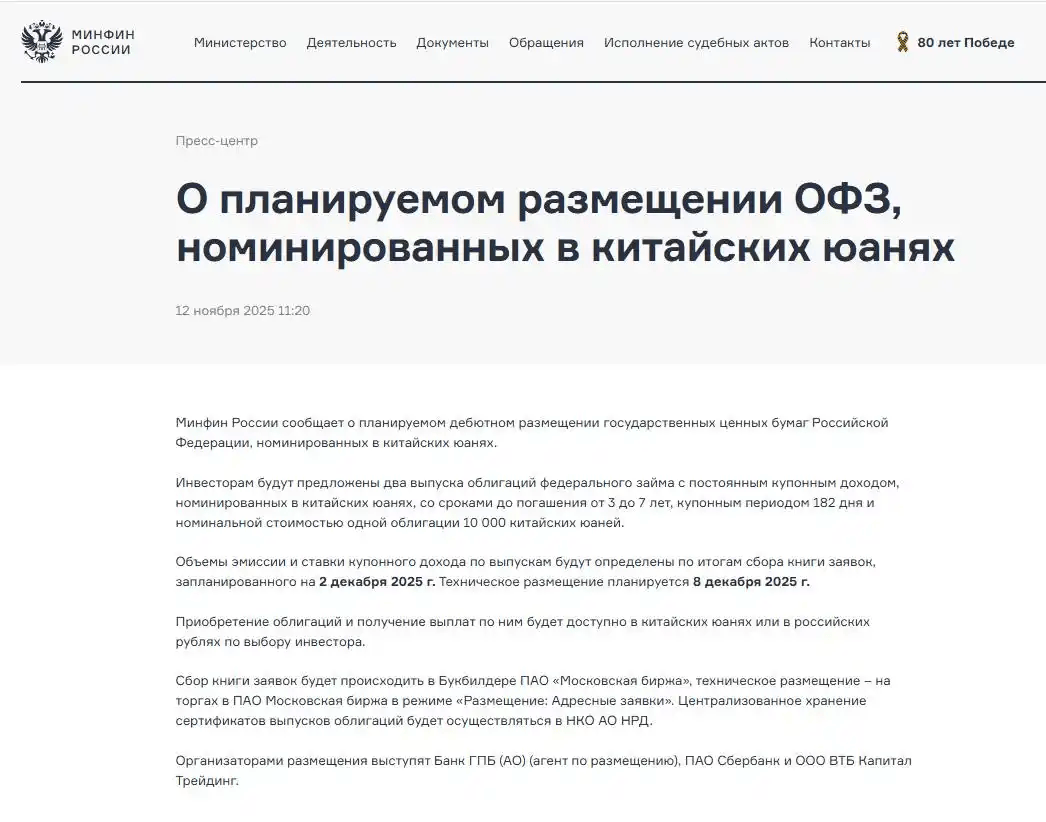 11月12日,俄罗斯财政部官网关于发行人民币债券的声明