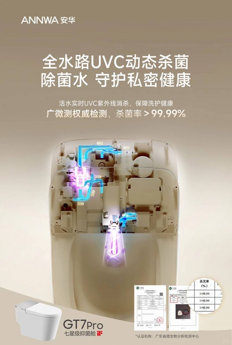 值得一提的是,安华GT7 Pro智能马桶内置FOF阻垢因子,可持续抑制水垢生成沉积,让喷嘴长期保持洁净通透,从源头避免堵塞困扰。此外,管道内还搭载了先进的动态水杀菌模组,能够通过UVC短波紫外线对流经管道的水流进行即时净化,为用户提供更安全的无菌水洗体验,让健康更可控。这些技术的应用,也标志着安华卫浴在健康卫浴领域的技术积累达到了新的高度。