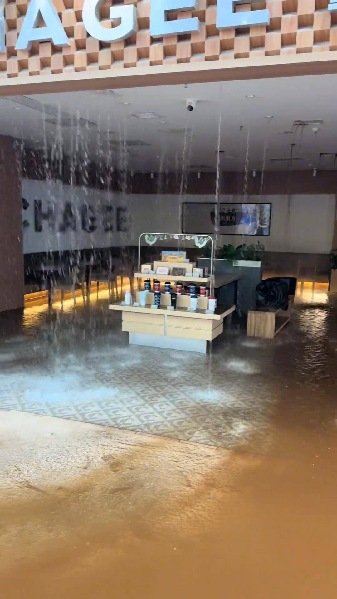 视频画面显示,一家位于万达广场一楼的霸王茶姬店内地面上流出了大量棕色的污水,从店铺里顶部灯具、摄像头、排风管道等部位里也流下了不少污水,现场水流如注。
