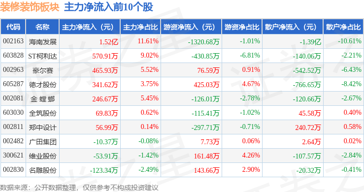 从资金流向上来看,当日装修装饰板块主力资金净流入2254.73万元,游资资金净流入372.37万元,散户资金净流出2627.1万元。装修装饰板块个股资金流向见下表: