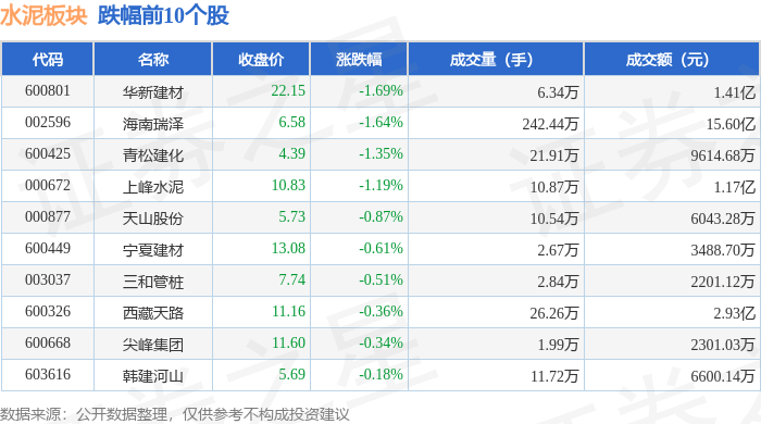 证券之星消息,12月2日水泥板块较上一交易日下跌0.25%,华新建材领跌。当日上证指数报收于3897.71,下跌0.42%。深证成指报收于13056.7,下跌0.68%。水泥板块个股涨跌见下表:
