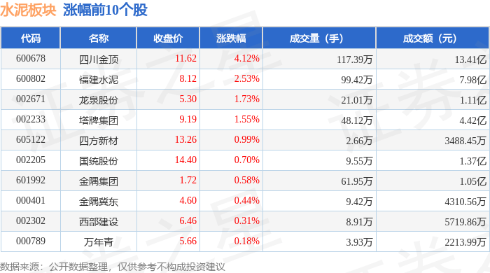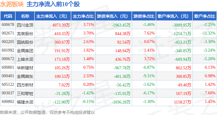 从资金流向上来看,当日水泥板块主力资金净流出2.14亿元,游资资金净流出4123.38万元,散户资金净流入2.55亿元。水泥板块个股资金流向见下表: