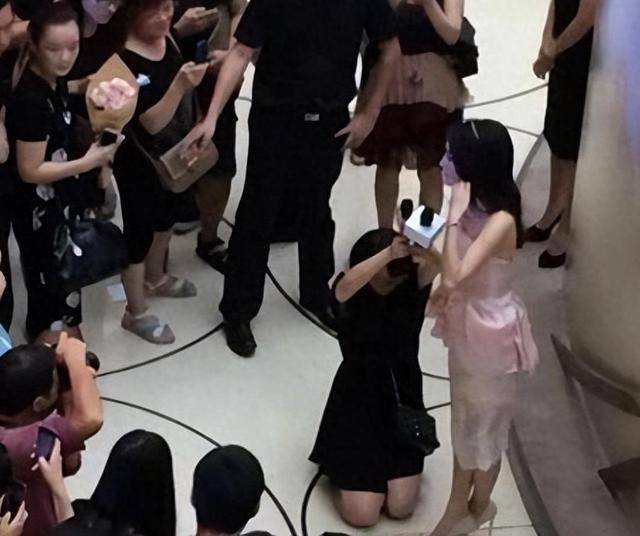 她作为一个公众人物去商场参加活动,一位工作人员双膝跪地用手为她举着话筒。