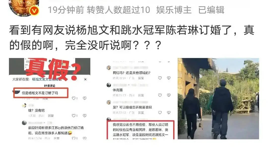 搜狐娱乐讯 近日,网传演员杨旭文和跳水冠军陈若琳已经偷偷订婚了,引发热议。对此,杨旭文工作室迅速在社交平台上发文回应道:“假。”