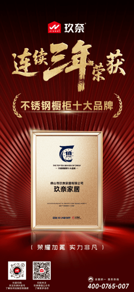 近日,佛山市玖奈家居有限公司再传捷报 —— 成功连续三年斩获 “不锈钢橱柜十大品牌” 荣誉,以硬核实力在行业赛道中持续领跑。