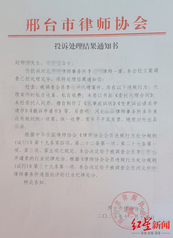 11月14日,邢台市律师协会向刘某福夫妻回复投诉处理结果通知书。通知书中称,经查,被调查会员李某军代理案件,存在以下违规行为:代理案件时私自收案、私自收费;未签订书面《委托代理合同》;未经委托人同意,擅自制作了《民事起诉状》《变更诉讼请求申请书》《撤诉申请书》等。另查明:河北某律师事务所多年来没有做到统一收案、统一收费,常年不开具发票,随意对外出具公函。