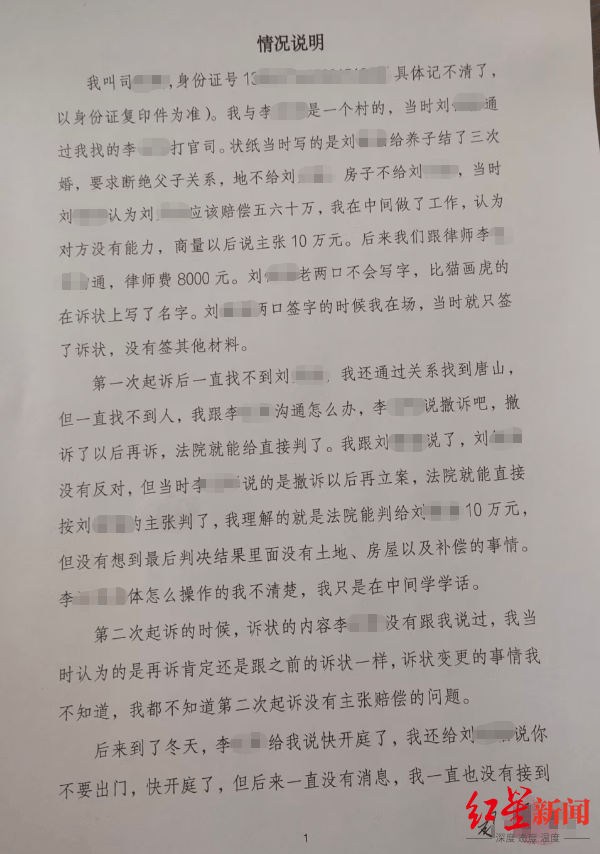 刘女士告诉记者,彼时打官司的想法是二老私下的决定,其他子女并不知情,他们也是事后才知道父母已通过司某某联系上河北某律师事务所律师李某军,“我父母当初的诉求是请求与刘某波解除收养关系,请求归还6亩地、宅基地,以及索要部分(包含刘某波两次离婚三次结婚费用、刘某福夫妻医药费10万元等)补偿。”