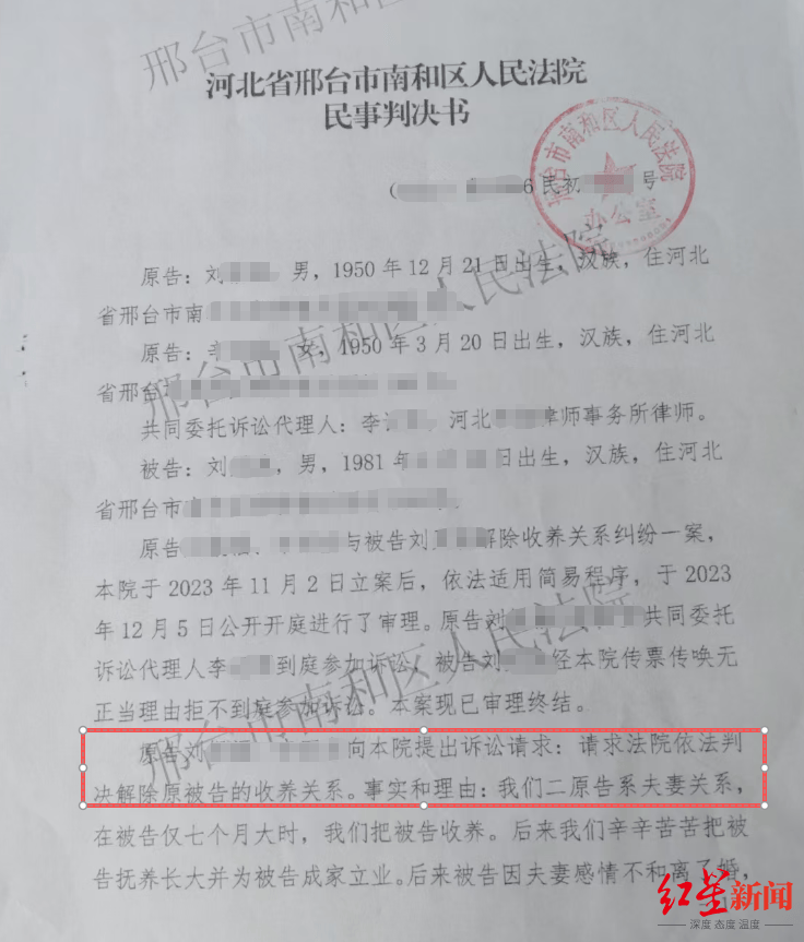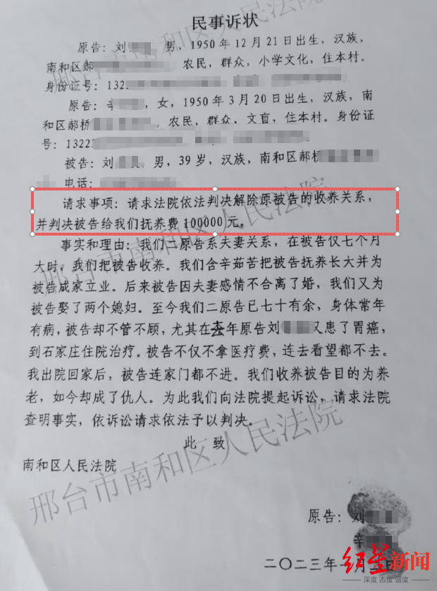 2023年1月,河北省邢台市南和区人民法院收到了一份民事诉状。上面显示,刘某福夫妻作为原告,请求法院依法判决解除与刘某波的收养关系,并判决刘某波给原告抚养费100000元。但不久,该诉状又申请了撤销。