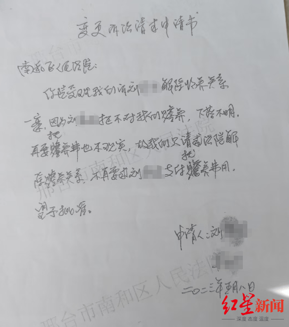 在上述案件的民事判决书中,红星新闻记者看到,刘某福夫妻作为原告,仅向法院提出依法判决解除原被告的收养关系,的确未曾提到归还承包地、宅基地以及10万抚养费等诉求。而刘女士等人在卷宗里查看的“变更诉讼请求申请书”则显示刘某福夫妻称,“因为刘某波拒不对我们赡养,下落不明,再要赡养费也不现实,故我们只请求法院解除赡养关系,不再要求刘某波支付赡养费用。”