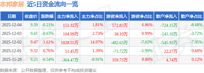 证券之星消息,截至2025年12月4日收盘,志邦家居(603801)报收于9.39元,下跌0.21%,换手率2.02%,成交量8.77万手,成交额8344.89万元。