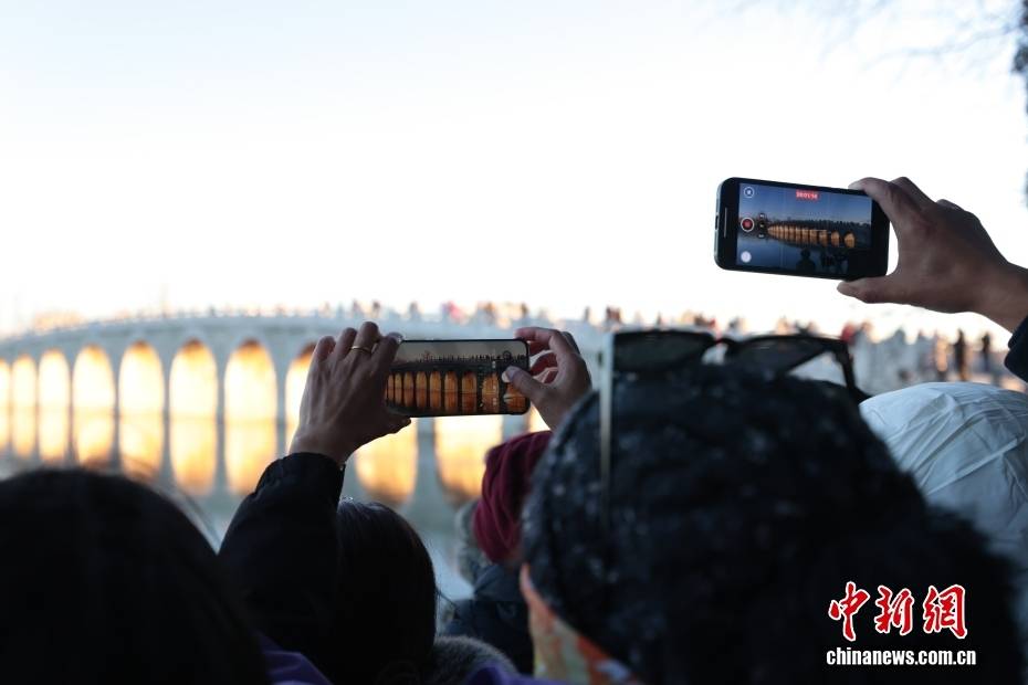 12月4日,北京颐和园十七孔桥“金光穿洞”景观进入观赏期,吸引众多游客拍照。中新社记者 杨郁然 摄