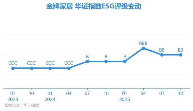 日前,华证指数公布了新一期(2025年10月31日)的ESG评级结果,金牌家居(603180.SH)获得BB评级(华证指数评级为C起至AAA九档,C为最低档,AAA为其最高一级评级/AA为其第二档),上一期(2025年7月31日)ESG评级为BB。本期ESG评级在148家家庭耐用消费品行业A股上市公司中排名第34(上一期排名第36)。