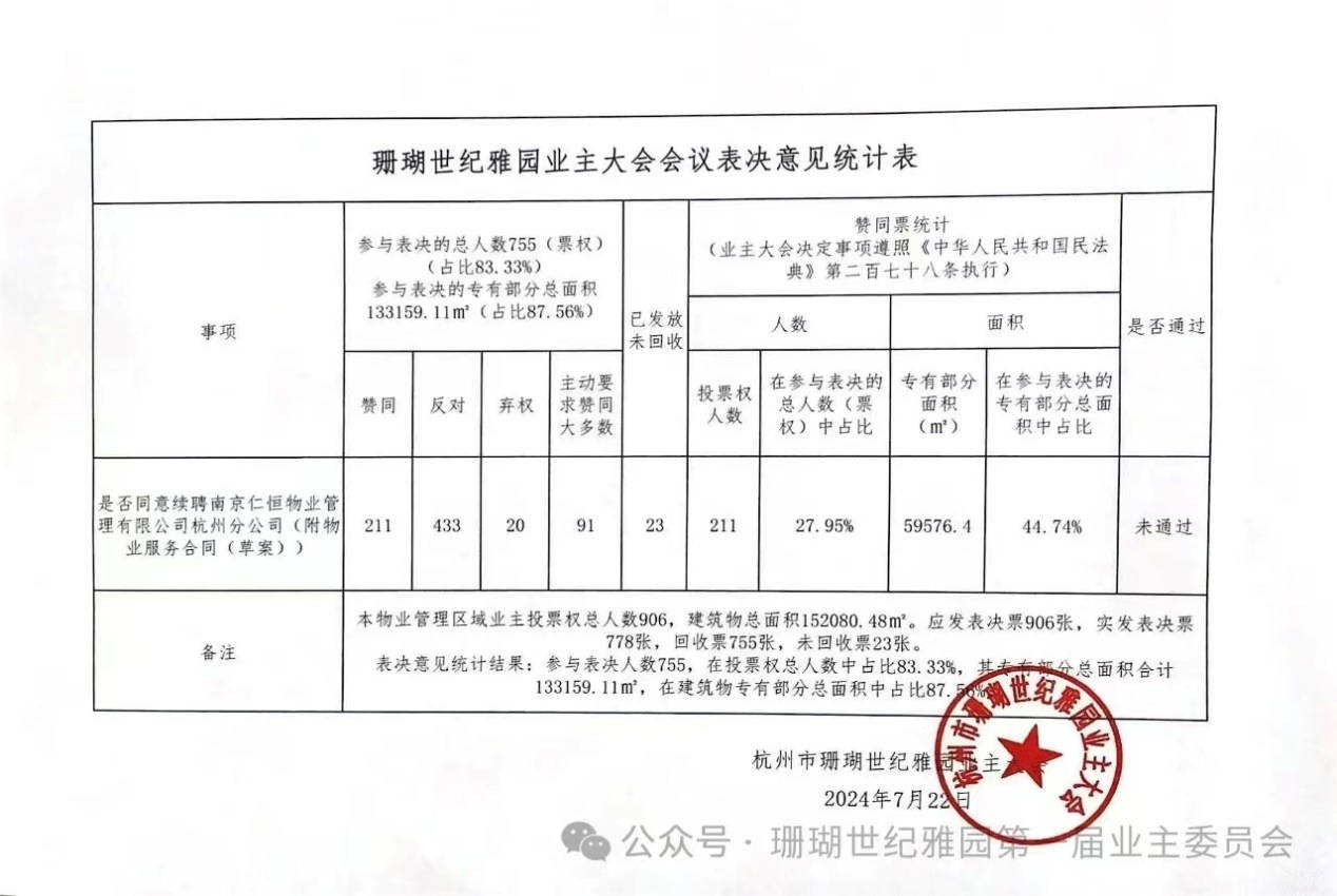 2024年4月底,珊瑚世纪首届业委会成立。和很多次新小区一样,由于对物业服务不满,珊瑚世纪业委会一成立就打算撤换物业。2024年6月,业委会决定召开业主大会,议题之一就是投票表决是否同意续聘仁恒物业。2024年7月,表决结果出炉:赞同续聘仁恒物业的有211户,反对续聘仁恒物业的有433户。最终,仁恒物业因为赞同率未能过半而被“赶”了出去,并于2024年11月底正式撤场。