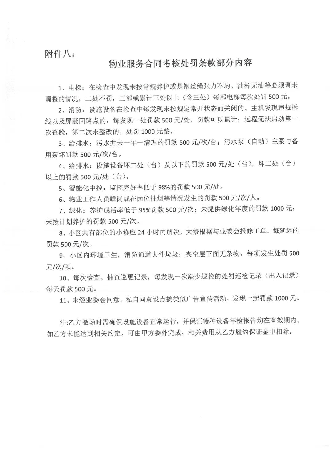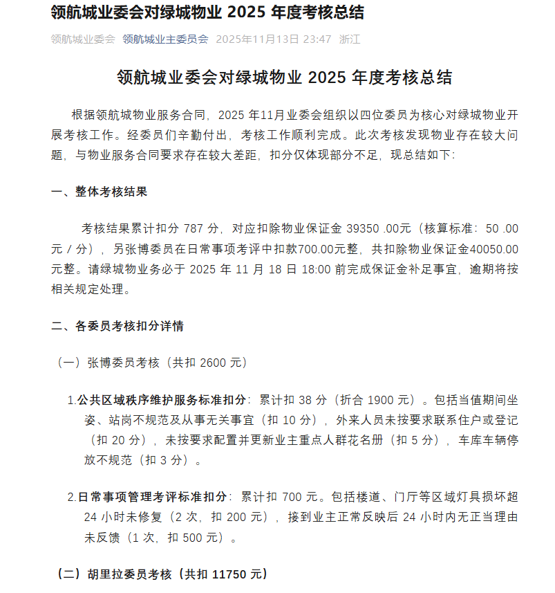 领航城在物业合同补充协议中设置了扣分条款,如消防关键岗位无上岗证书的,一人扣20分;虚报人员配备的,少一人扣50分;急修超过30分钟未到场的,每次扣2分。近期,领航城业委会公布了对物业的考核结果,累计扣分787分,扣罚物业保证金39350元。