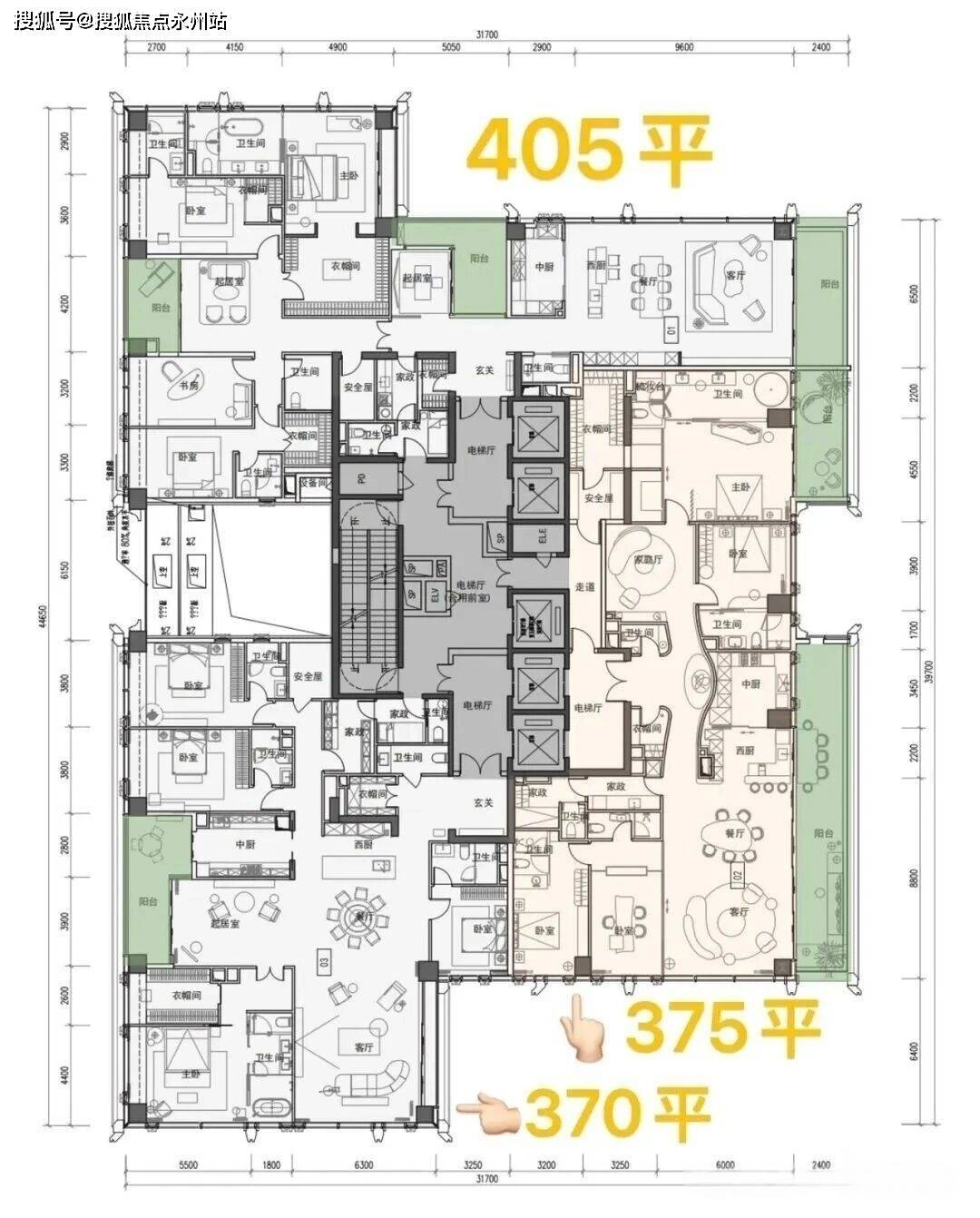 王牌户型:375㎡4+1 房五卫(四套间+家庭厅+家政套间)—— 这是我们团队一致认为的“最优解”。