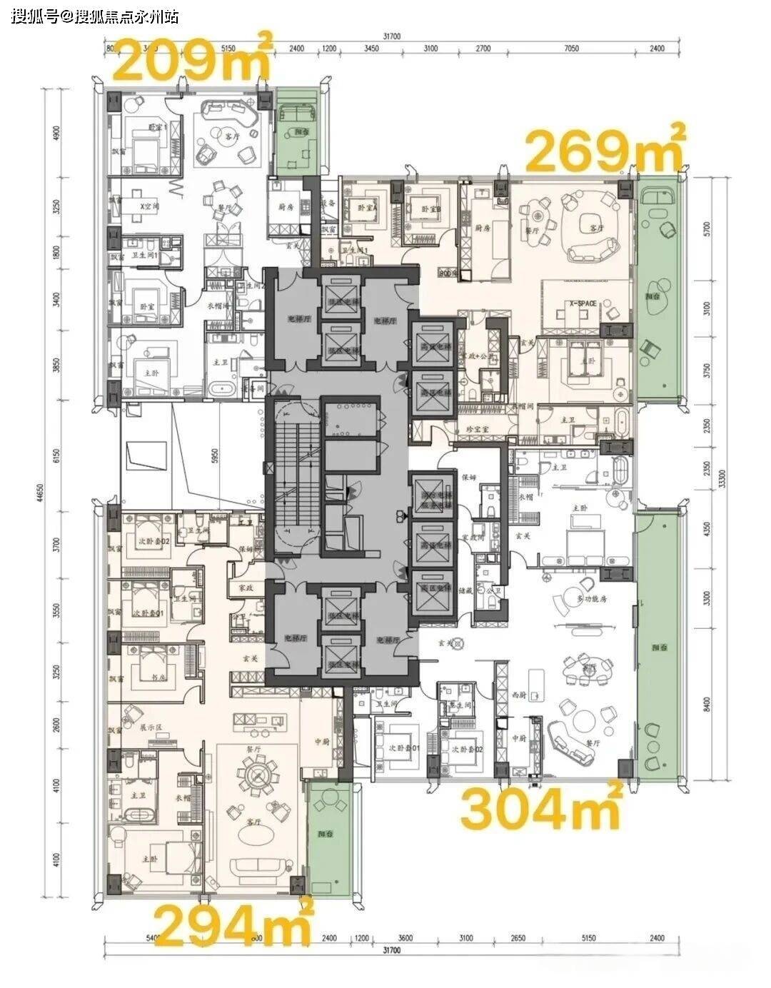 269-304㎡四房/4+1房:269㎡带家政套间,294㎡多一个“+1灵活空间”(可做书房/茶室),304㎡四卫全明,适合多代同堂,总价3800-5000 万。