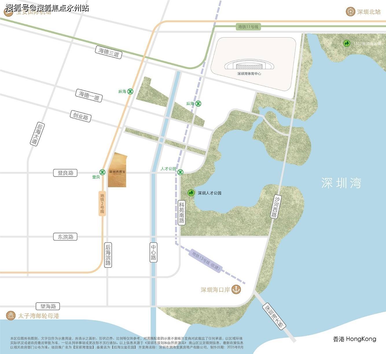 项目位于南山区粤海街道逸湖二街与后海滨路交汇处,东临深圳湾公园,西接后海总部基地,北靠人才公园,南望深圳湾海域,占据粤港澳大湾区核心区位。