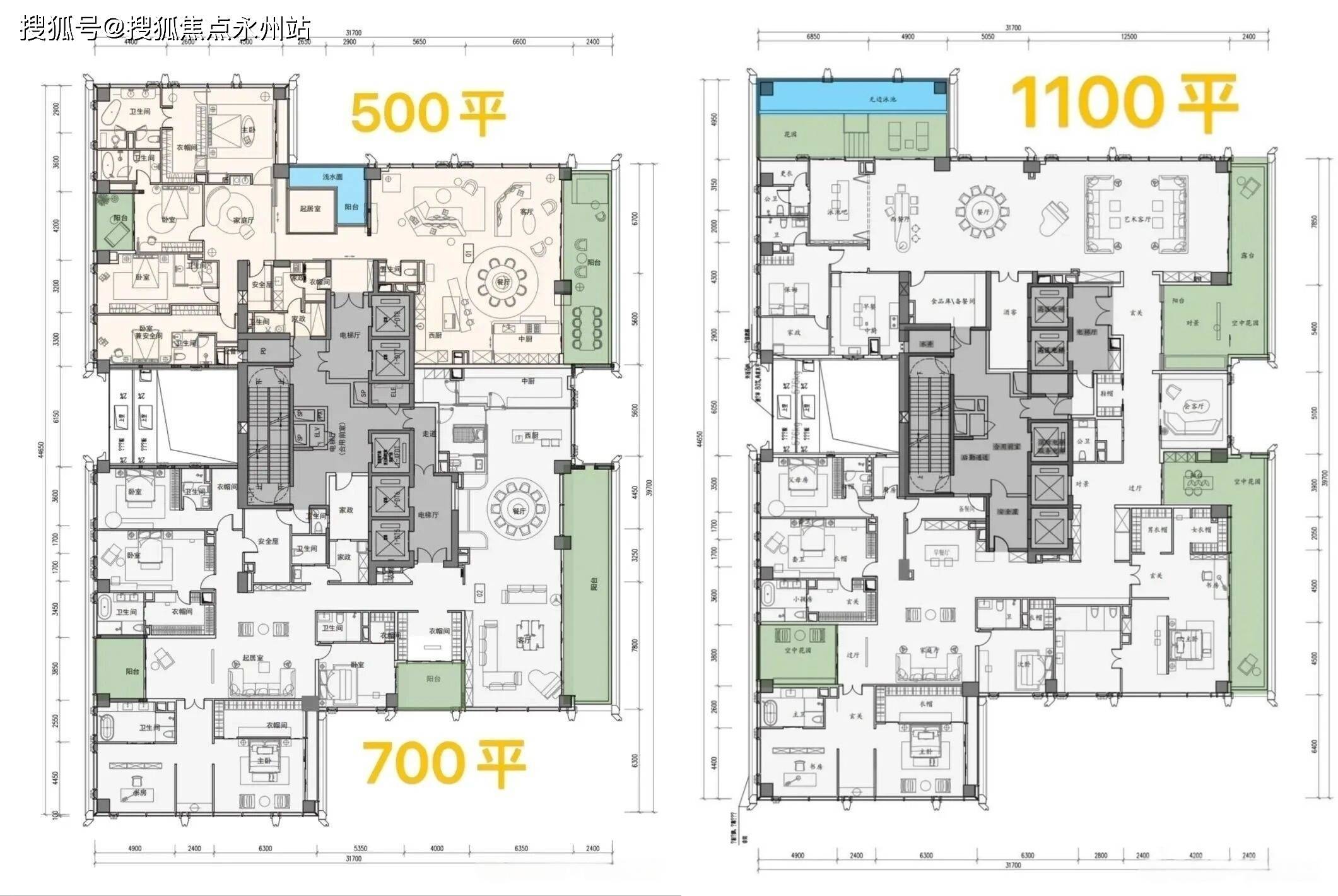 顶流户型:500-700㎡大平层(无剪力墙,可自由改造)、1050㎡顶楼 Penthouse(仅3套)。