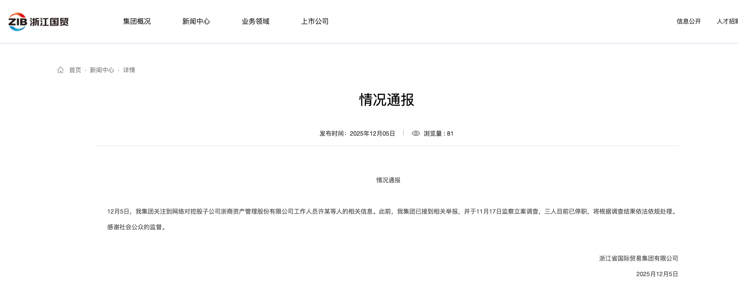浙江省国际贸易集团有限公司发布情况通报称,12月5日,集团关注到网络对控股子公司浙商资产管理股份有限公司工作人员许某等人的相关信息。此前,集团已接到相关举报,并于11月17日监察立案调查,三人目前已停职,将根据调查结果依法依规处理。