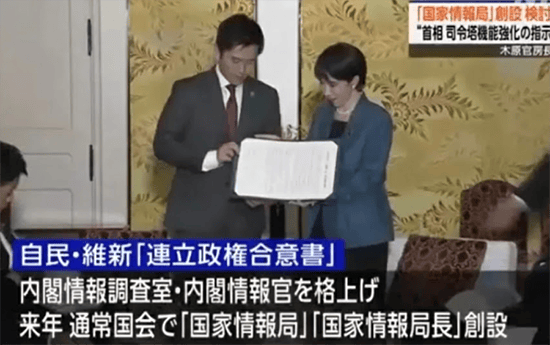 据了解,日本现任首相高市早苗曾长期主张提升日本情报能力,并在竞选纲领中明确提出设立“国家情报局”的构想。与日本自民党联合执政的日本维新会也持相同立场,双方在10月20日签署联合执政协议时,将创设该机构的方针正式写入政策纲领。