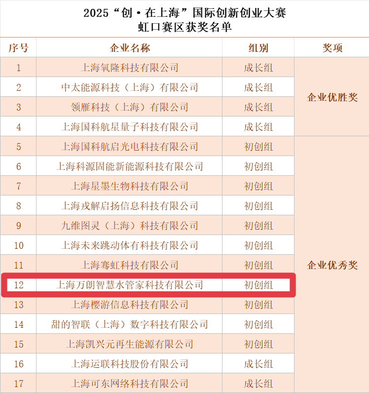 在本届赛事中,虹口本土企业创新成果丰硕,共有17家企业获奖。其中,4家企业荣获“企业优胜奖”,13家企业获得“企业优秀奖”。值得一提的是,今年6月入驻“轻舟·华创”孵化器的初创企业——上海万朗智慧水管家科技有限公司,凭借其在智慧水务领域的创新解决方案,成功斩获“企业优秀奖”。该公司专注为城市管网、供排水、水环境等项目治理与管理提供专业化、系统化、智慧化的一站式解决方案,其技术实用性及市场潜力受到评审肯定。